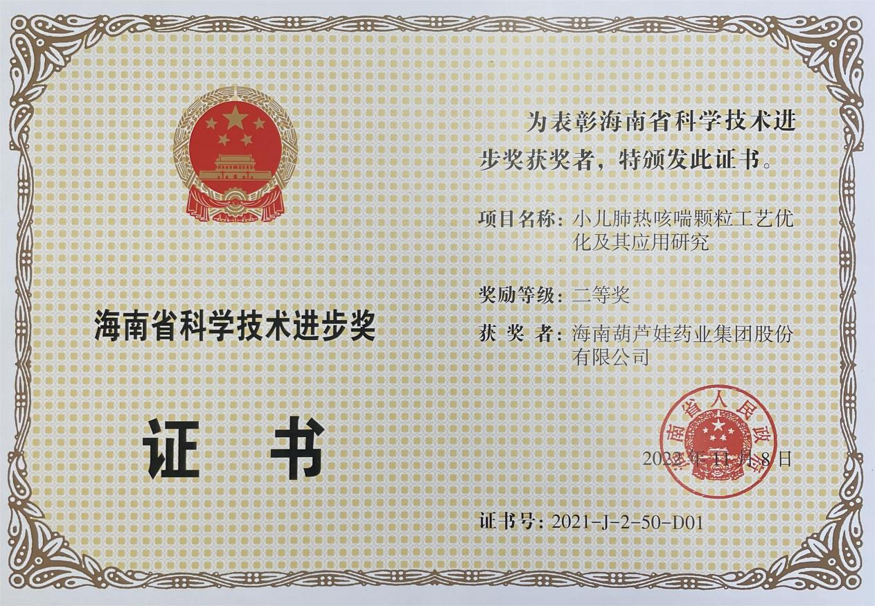 为此,小儿肺热咳喘颗粒的制备方法获得了第二十一届中国专利优秀奖(2019年),专利申请号:ZL201010134951,此次作为专利技术的应用,获得了2021年度海南省科学技术进步奖二等奖。在此之前,AG8旗舰厅牌小儿肺热咳喘颗粒还多次被授予“临床价值中成药品牌”、“中国连锁药店最具合作价值单品”,荣登“中国医药品牌榜”。